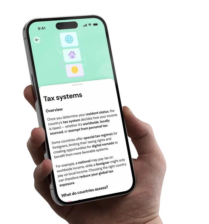 It does not replace the expertise of a certified tax professional. If you need personalized advice, the app can connect you directly with licensed tax experts and partner firms in your country of interest.